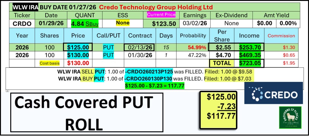 Sometimes the best thing to do is to let the option be called and buy the shares. This time, however, I decided to roll the put. Rolling a put requires a single transaction that doesn’t take any more time than the original Put contract required. Fidelity automatically creates a buy put order for the $130 contract that looks like this: “-CRDO260130P130 was FILLED. Filled: 1.00 @ $7.03.” In other words, I paid $703 to get out of the old contract that would have expired on Friday.