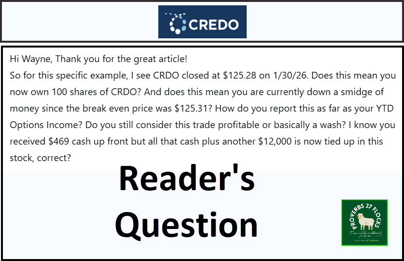 So for this specific example, I see CRDO closed at $125.28 on 1/30/26. 1) Does this mean you now own 100 shares of CRDO? 2) And does this mean you are currently down a smidge of money since the breakeven price was $125.31? 3) How do you report this as far as your YTD Options Income? 4) Do you still consider this trade profitable or basically a wash? 5) I know you received $469 cash up front but all that cash plus another $12,000 is now tied up in this stock, correct?” – Dino