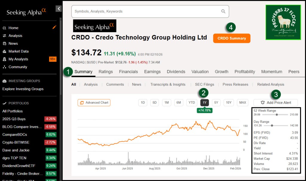 There are so many resources on the Seeking Alpha web site that it is easy to be overwhelmed. For example, if you are looking at an individual stock like CRDO (Credo Technology Group Holding Ltd) the main tabs are Summary, Ratings, Financials, Earnings, Dividends, Valuation, Growth, Profitability, Momentum, Peers, Options and Charting.