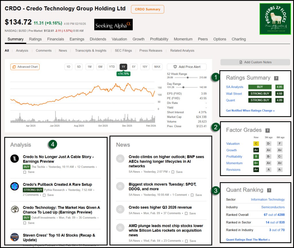 Sometimes there is a box at the top that says something like (4) “CRDO Summary.” This is another helpful overview of the company. I especially like the section called “Seeking Alpha Quant Rating Explanation.” For example for CRDO it talks about Growth: “Growth: CRDO exhibits phenomenal growth with Revenue Growth Forward of 106%, far exceeding the sector’s 9%. Additionally, its Operating Cash Flow Growth YoY is an impressive 2783%, showcasing strong financial performance.”