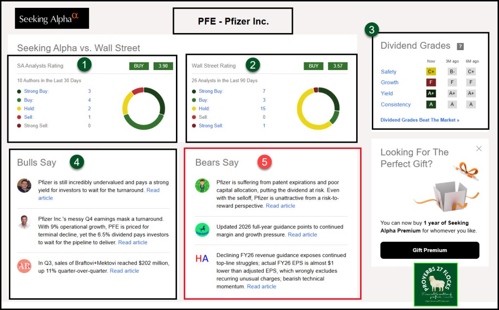 It is also helpful to see what the optimist bulls (4) think about PFE, and what the pessimist (or realist) bears (5) are thinking. Bear in mind, however, that the SA QUANT rating is my first measure of the likely benefit of purchasing an ETF or stock.
