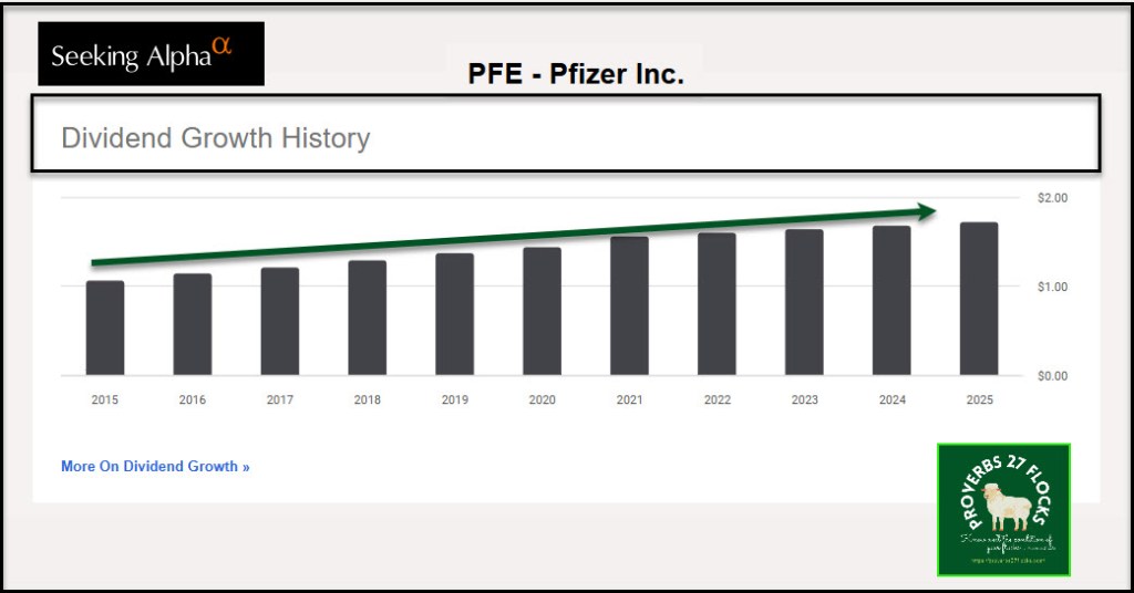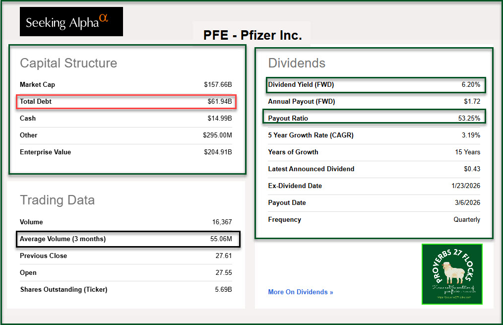 A company’s debt can be problematic. It is worth noting that PFE has $62B dollars in debt. That will scare off some investors. Dividends are always of interest to a dividend growth “easy income” investor. Pay attention to the “Payout Ratio.” If it is greater than 70% for most investments, that can be a warning flag.