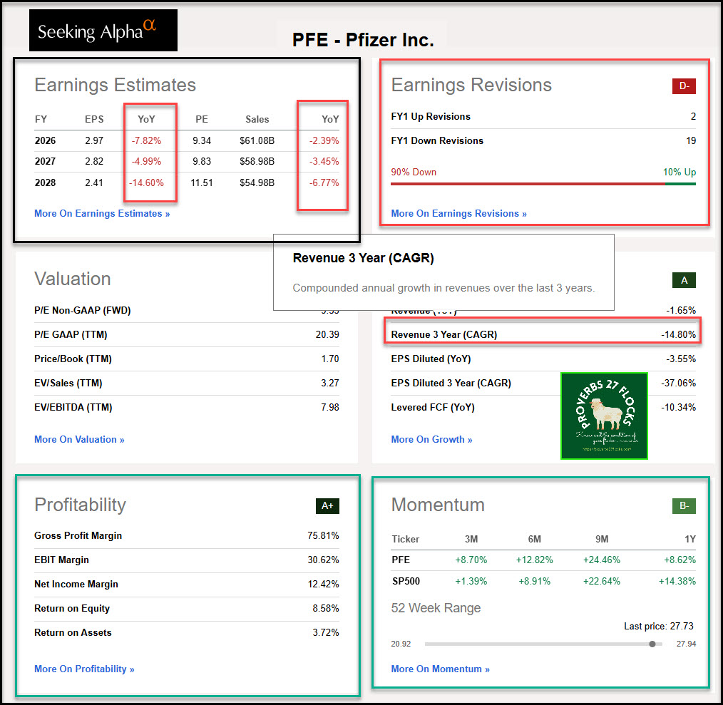 On the right side of the image you can see the “Dividend Grades.” If you are buying any investment that pays a dividend your expectation should be that you will be paid. In the case of Pfizer (3) the dividend growth grade is “D” but the “Yield” and “Consistency” are strong. In an ideal state, everything should be green or at least yellow.