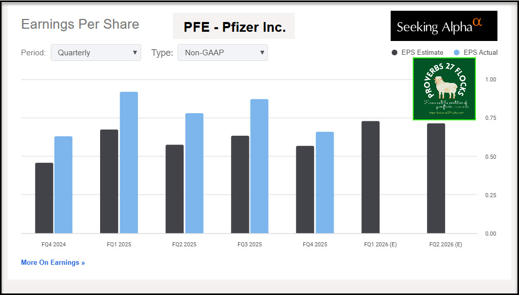 Just below Revenue is EPS. Some businesses are seasonal, so bear that in mind when you look at this graph. Also pay attention to the EPS “Estimate” and the EPS “Actual.” In the following illustration you can see the blue bars are taller than the black ones. This means the “analysts” tended to be more pessimistic about PFE than perhaps was warranted. Of course, pessimism and optimism are happening at the same time by various individual investors and analysts. In general, I like it when the blue is winning.
