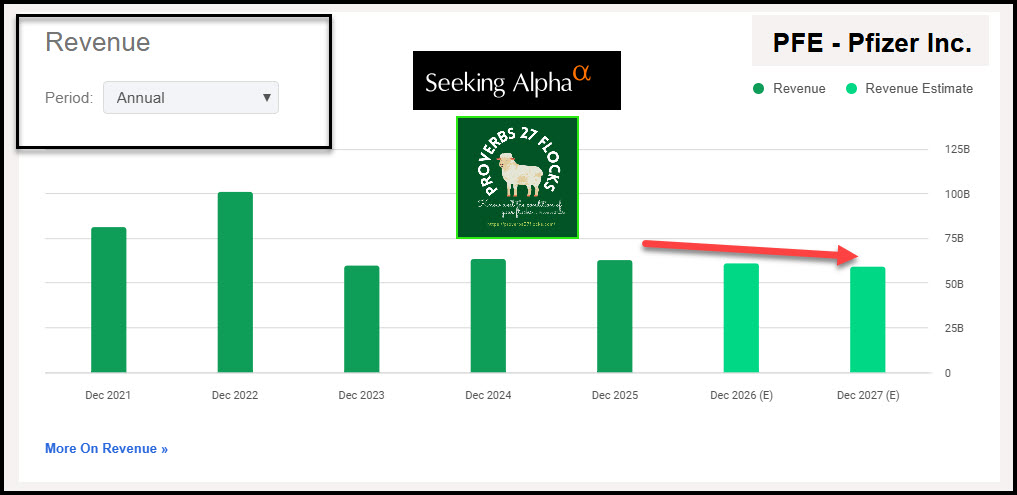 Further down on the summary page you can see a graph that shows revenue trends. Which direction is sales revenue going? Generally speaking, decreasing revenues is not an encouraging sign. However, this could turn quickly if Pfizer has a huge success.