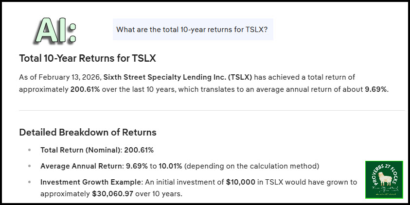 Be careful when using AI, but I have found it to be somewhat helpful when wanting basic information about a specific stock or ETF symbol. Even if the numbers are a bit off, I have found the AI answers to be helpful in seeing reality. I used AI to find out the ten-year returns for ABBV, ARCC, and TSLX. Here are the answers I received. (Full Disclosure: I currently own shares of ABBV and ARCC.) At the current prices I am very tempted to buy shares of TSLX. I sold our shares in October 2025 to free up some cash.