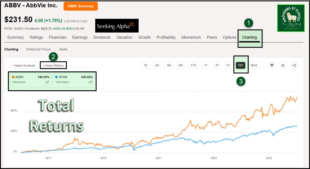 It takes just a minute to see and compare total returns for various investments. When you select “Charting” from the top menu for any stock or ETF, you can then also select metrics and add symbols to compare multiple stocks against the S&P 500. This illustrates the comparison of ABBV with TSLX and ARCC.
