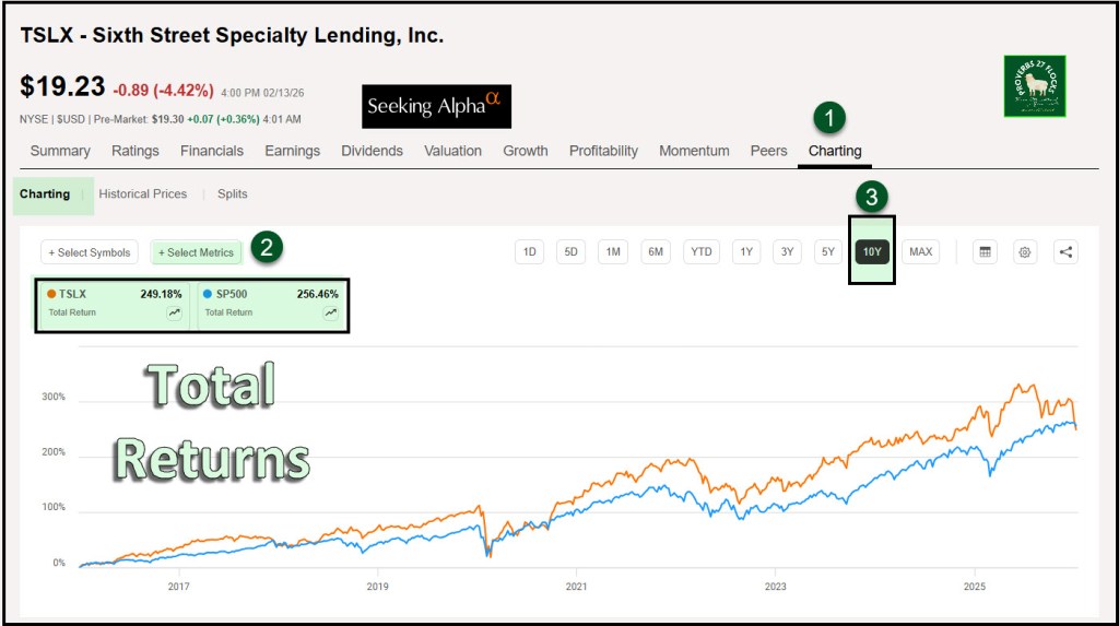 “What are the total 10-year returns for TSLX?” As of February 13, 2026, Sixth Street Specialty Lending Inc. (TSLX) has achieved a total return of approximately 200.61% over the last 10 years, which translates to an average annual return of about 9.69%.