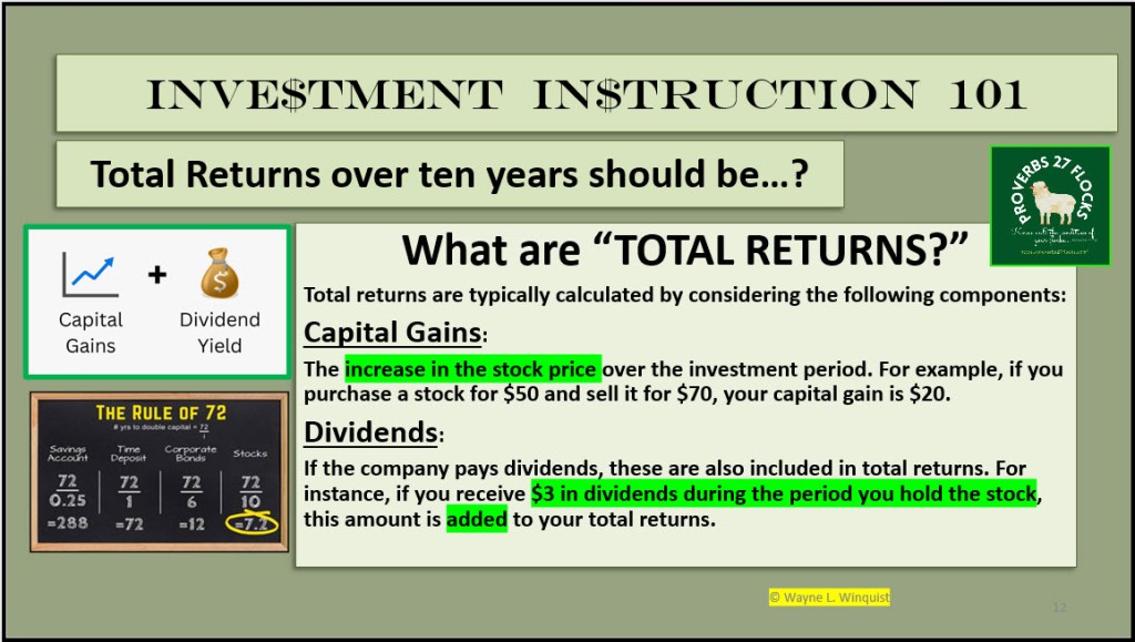 Most novice investors do not understand total returns. If you own chickens, there is more than one way to benefit. You can get eggs and eat them or sell them. You can catch the chicken and fry it. Or you can hatch the eggs and get more eggs to grow your flock and increase your egg and frier production. The same is true in the world of investing.