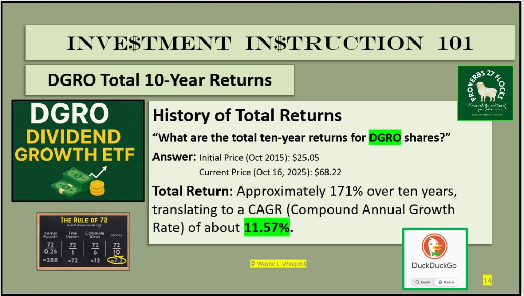 Here are two slides from the lesson I taught. They help explain the positive addition of dividends to the price returns to create total returns for ETF DGRO.