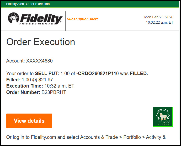 These images are the emails I received when I bought back my original CRDO put contract and sold a new one.