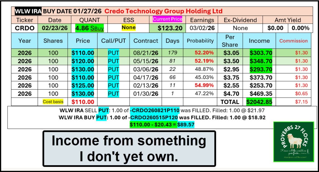 My first serious look at CRDO was on January 27, 2026. Back then the price per share was just over $129. Since then it has gone as low as $96.95 and as high as $134.72. I did not buy shares, but I decided to enter a cash covered put option to potentially buy the shares at $130. As the price dropped I entered option contracts to roll the contract price and the expiration date. This image shows all of the PUT trades for this single stock with the most recent trade at the top. I made over $300 for five minutes of puzzle work. If I was working a 9-to-5 job making $37.50 per hour, I’d have less time for other things and far less income after deductions.