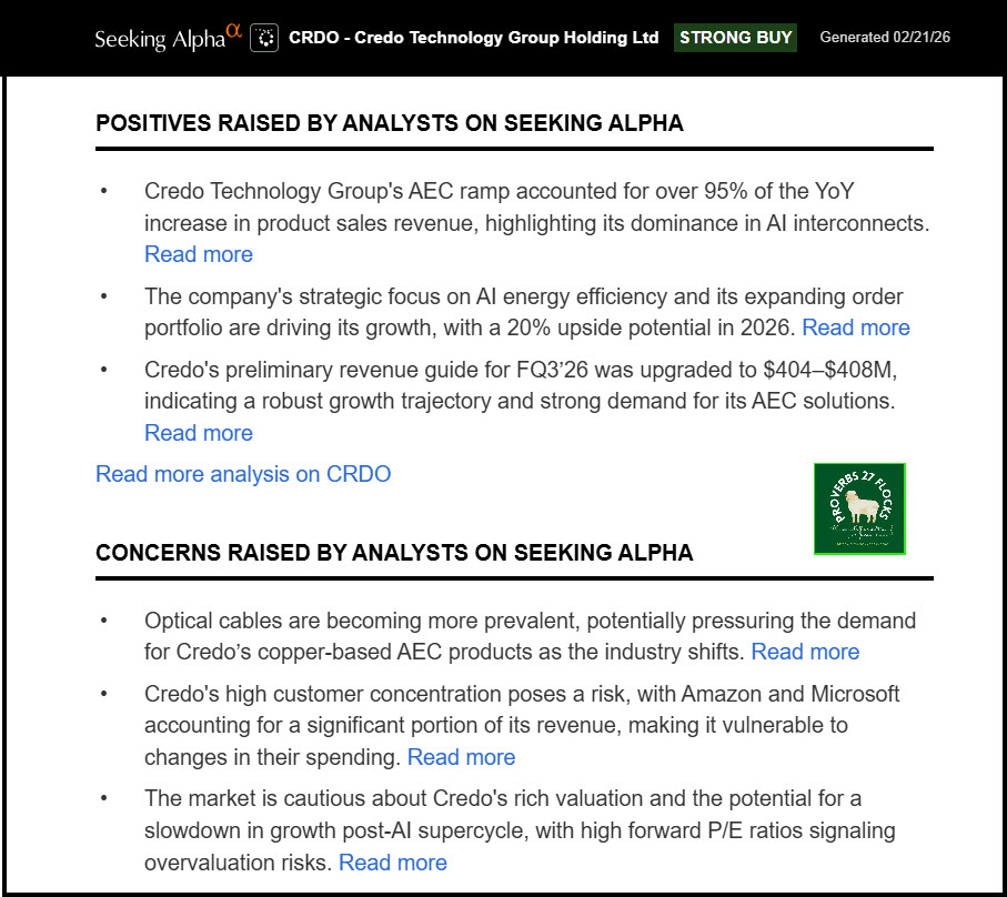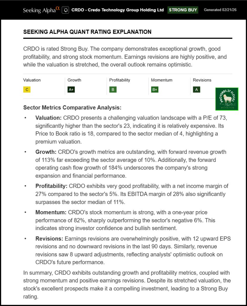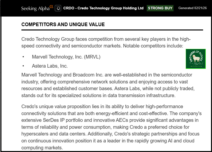 CRDO is an investment I would like to own but I don’t want to pay today’s price. The current Seeking Alpha QUANT rating is a Strong Buy (4.86 out of 5.00 at the time I write this) and the earnings estimates for this year, 2027, and 2028 appear to be very encouraging. Credo is in the semiconductor space, and it is located in the Cayman Islands. Credo provides various high-speed connectivity solutions for optical and electrical Ethernet, and PCIe applications in the United States, Taiwan, Mainland China, Hong Kong.