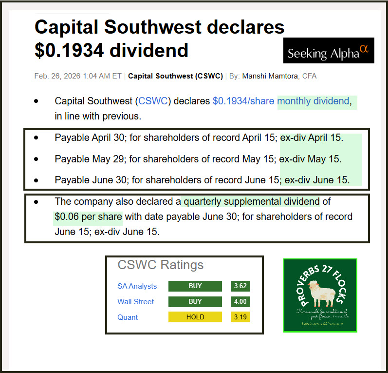 Just like my recent post about BDC MAIN, the most recent CSWC dividend announcement included the following four dividends. Three of them are monthly and are $0.1934 per share. The last one is “supplemental” and it is $0.06 per share. Supplemental dividends are unique and should not be considered repeatable. However, they are a nice present when they are paid. Here are the four announcements: