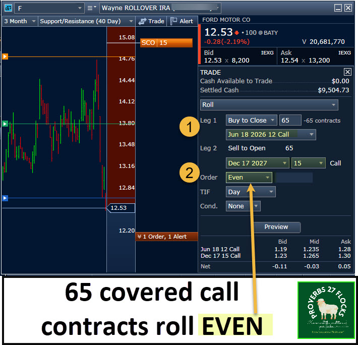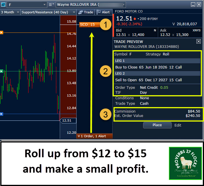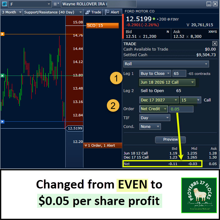 This opened a window of opportunity. I was able to roll the contract up to $15 by extending the contract expiration to December 2027. At first I would have been happy with an “even” trade where I did not make any money on the contract roll. However, it became apparent that I might be able to make $0.05 per share to roll the contracts, so I entered the covered call roll to see if I could find a buyer. I did, and that increases my potential profit significantly. In addition, there are several dividend payments between now and December 2027 (if Ford keeps paying the dividend) to sweeten the pot.