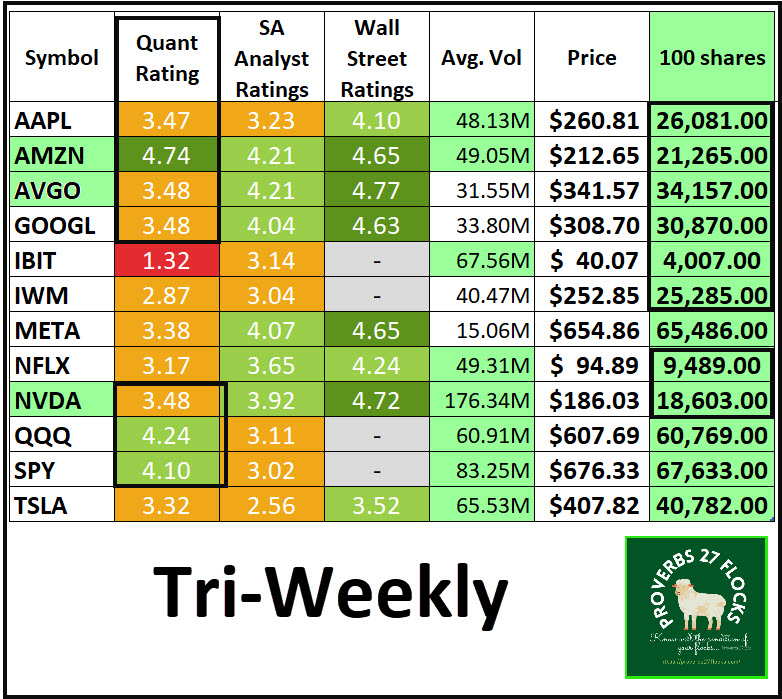 I created the following table on Seeking Alpha (I modified the downloaded table to show some key elements) so as to focus on stocks and ETFs with decent QUANT ratings and share prices that are not ridiculously high. Pay attention to the trading volume as well. The higher the trading volume the more potential for options activity as well. The three with the green highlight are stocks we already own: AMZN, AVGO, and NVDA.