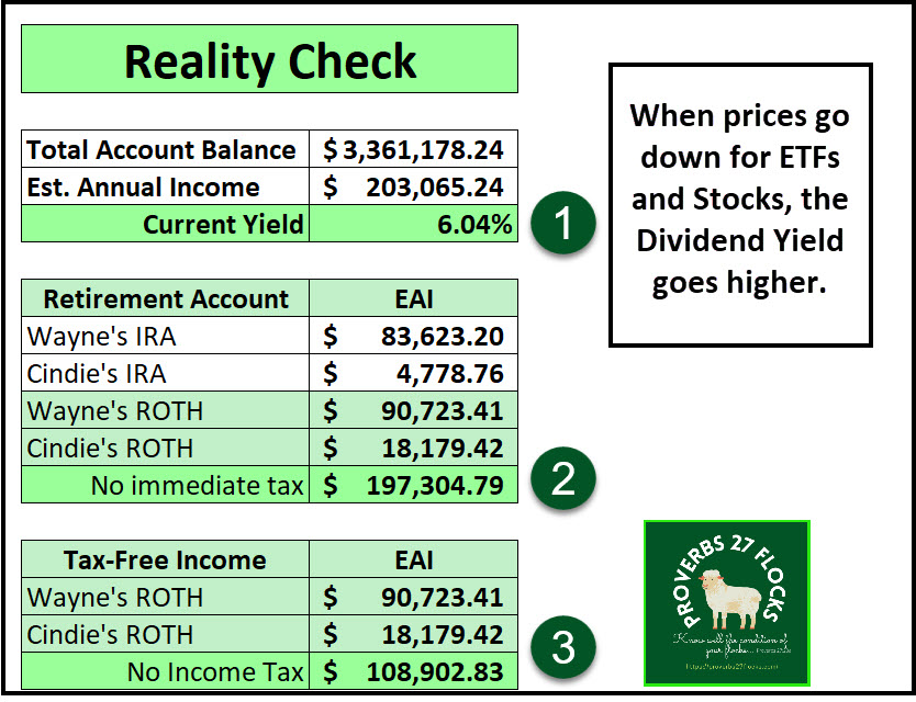 Note that our EAI for the ROTH IRA accounts this year will easily reach $108.9K. This is significant, as income taxes are not likely to go down. Remember this reality when you think about where you put your investments. I highly recommend the ROTH IRA or the ROTH 401(k) – if your employer offers that as an option.