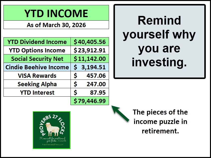 If you look at the total income for the first quarter (although some dividends are still coming for March 31), the total is $79.5K. I can tell you the trip to Costa Rica was far less than that. In fact, $23,401 of our YTD income has gone to charitable giving. We don’t need the cash that is generated using the easy income approach. It is best to invest it in eternal treasure where it will always be valuable.