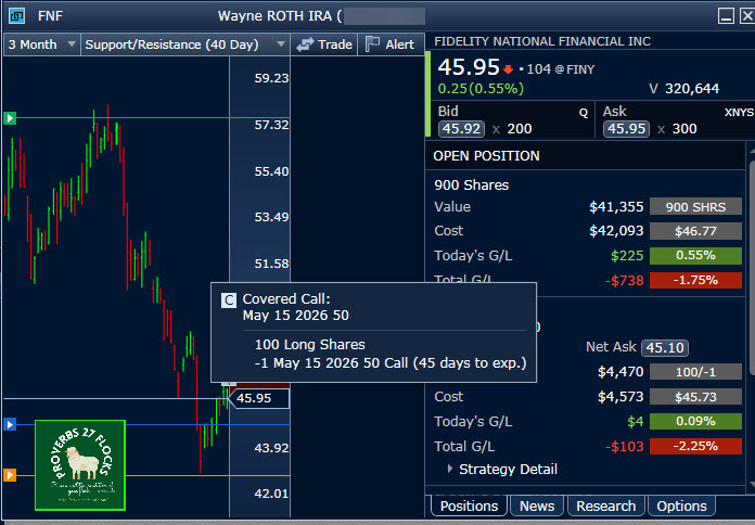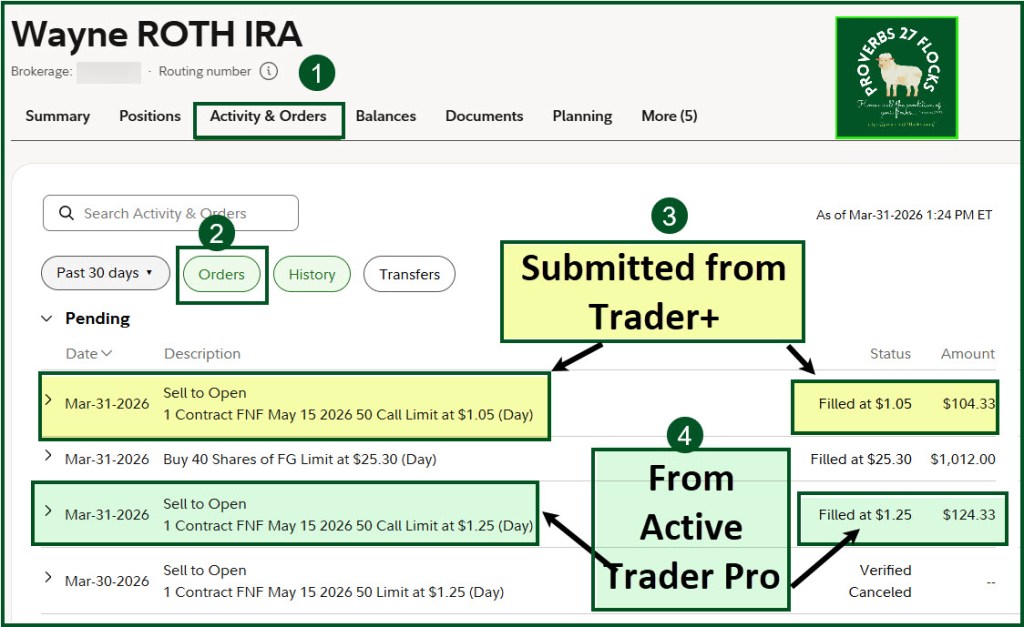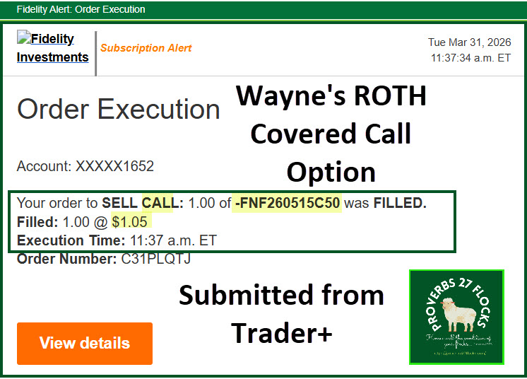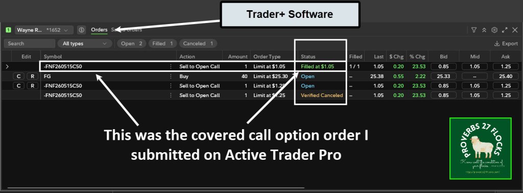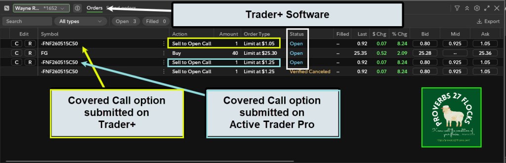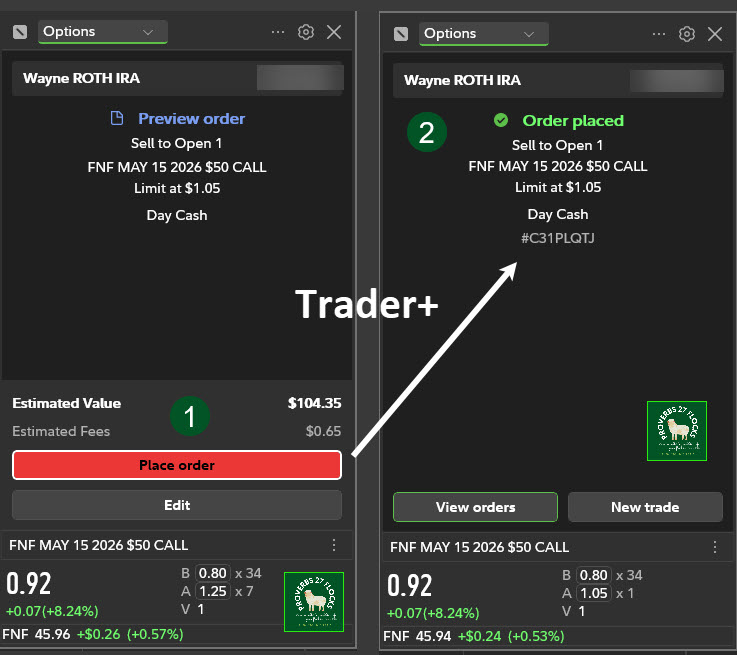 The third is Fidelity’s replacement for ATP. They call this software Trader+. In the next post I plan to show you what the ATP process looks like for entering a covered call option contract for 100 of my 1,000 shares of FNF (Fidelity National Financial, Inc.) as a review. Today, so that I could experience the differences in the options order process, I sold one covered call contract for $50 using ATP and then I sold one covered call contract for $50 using Trader+.