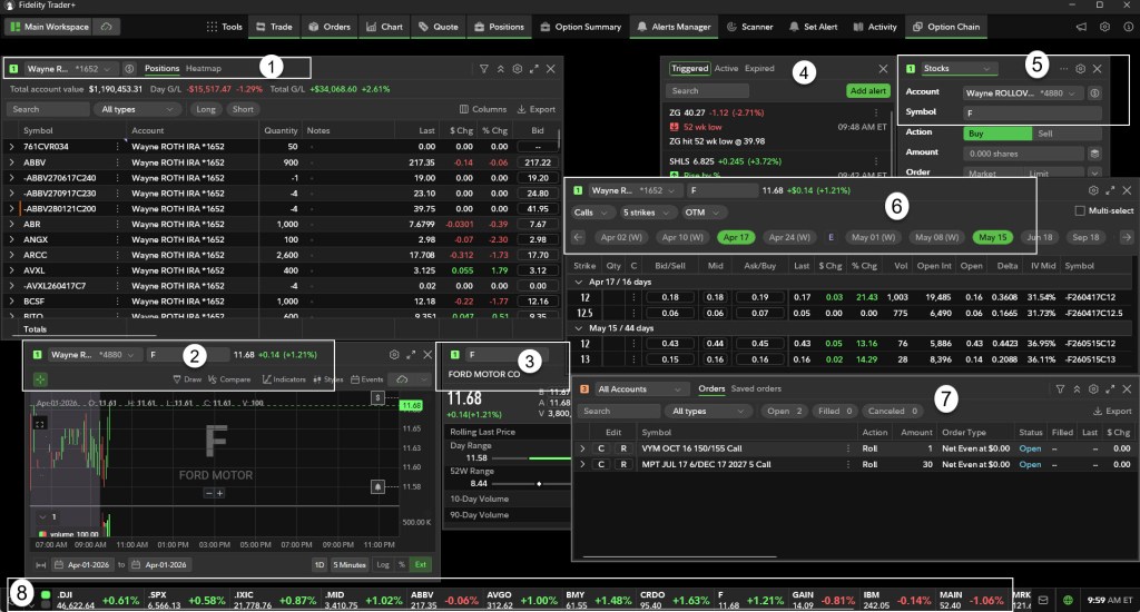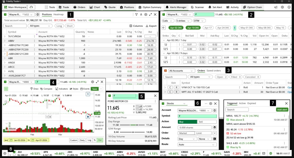 I numbered the windows and will briefly describe each one. Notice first of all, that four of the windows are all looking at ticker symbol “F” for our Ford investments. If I change the ticker symbol in any box that has a green “1”, then all of the green “1” windows change. This is a feature that I used in ATP and I like it.