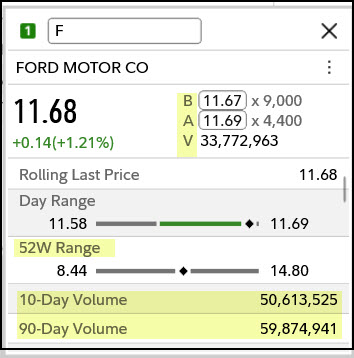The Quote window tells me some information about Ford’s stock including today’s price range and the 52-week range. It also shows the Bid (B), Ask (A), and today’s trading volume (V). I also like to see what Ford’s trading volume has been for the last ten and 90 days. Heavily traded stocks are good ones for options trading.