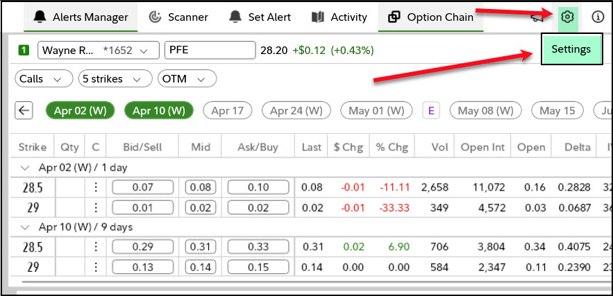 Because this window is linked, it automatically shows me options contracts for Ford. Ford has weekly options contracts, as can be seen by the dates across the top of this window. Also notice the “E” between April 24 and May 1. This is a helpful reminder that Ford will be reporting earnings before May 1.