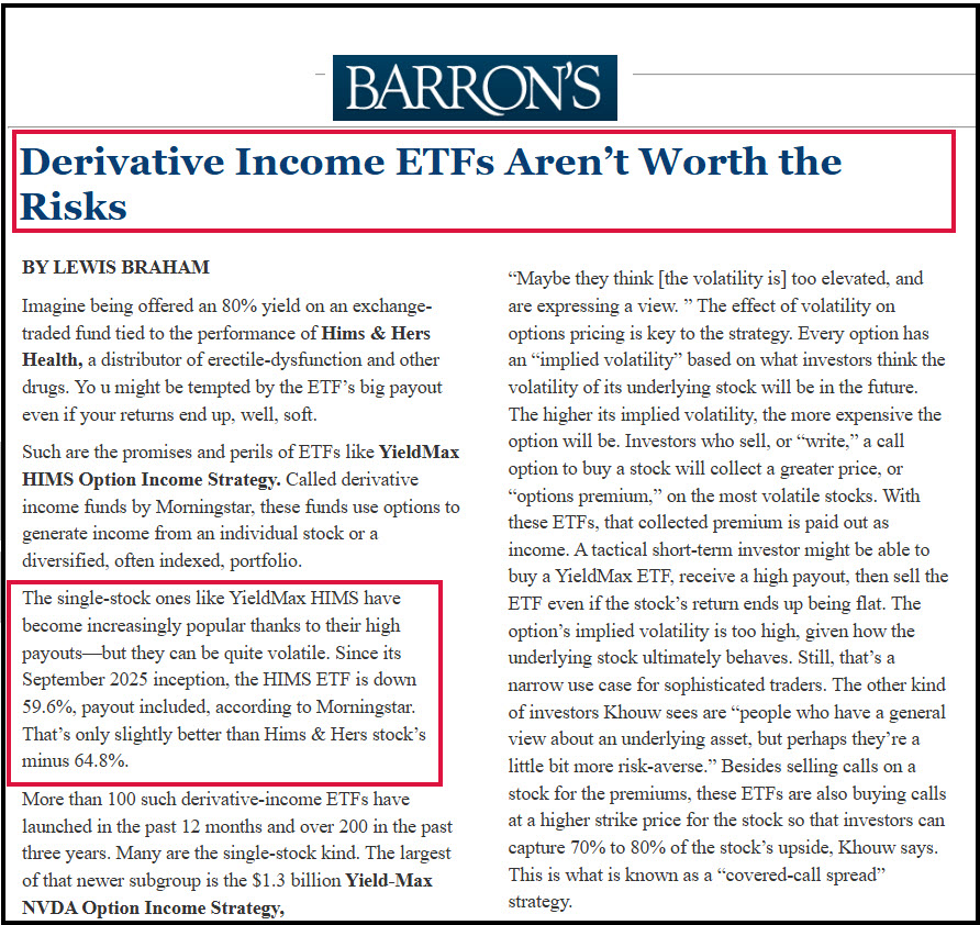 It is important to note that they were talking about single stock derivative ETFs. “Categorized as derivative income funds by Morningstar, these funds use options to generate income from an individual stock or a diversified, often indexed, portfolio.” Barron’s