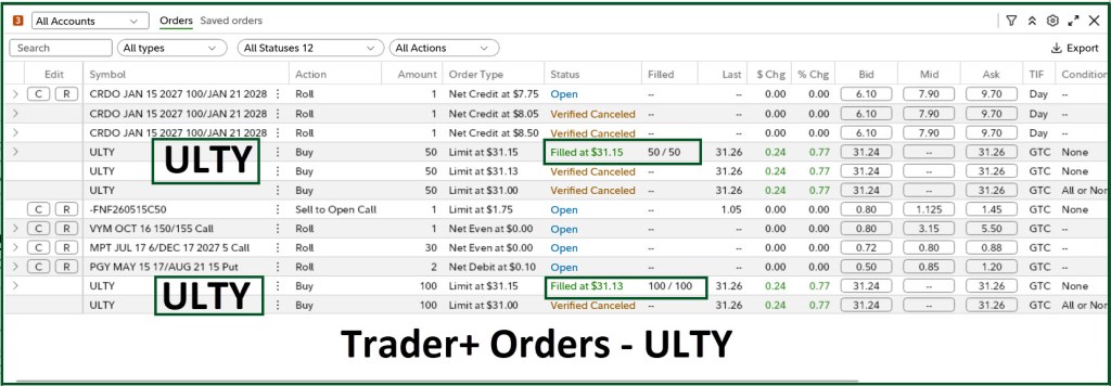 In addition, I did a ROTH conversion from my traditional IRA to the ROTH of 300 ULTY shares. This was done in August when the price of the shares was much higher. However, the dividends I am earning in my ROTH are tax free. If I did not still have to finish my 2026 RMD, I would move more of the ULTY shares from my traditional IRA to the ROTH.