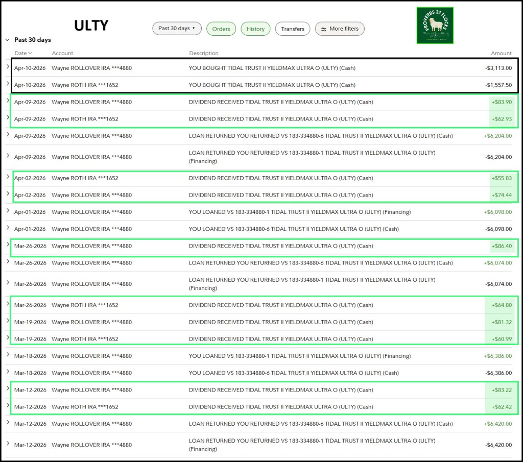 ULTY pays a weekly dividend. The following image from Fidelity’s Activity page shows the transactions related to this investment from March 12 to the present. As you can see dividends have been paid weekly. At the top you can also see that I added some shares of ULTY to both my IRA and my ROTH.