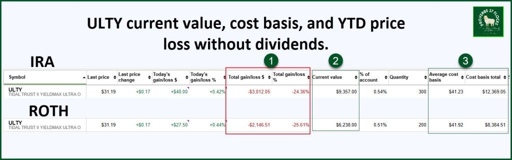 Novice investors can be “deceived” when looking at YTD investment returns. For example, when I look at my positions in ETF ULTY, it would appear that I made a terrible mistake in buying this alternative ETF. Not only is the expense ratio (1.30%) very high, but the price returns have been poor. This image shows the 300 shares in my traditional IRA with a loss of about 24% and 200 shares in my ROTH with a loss of about 25.6%. On the surface this looks like a loser.