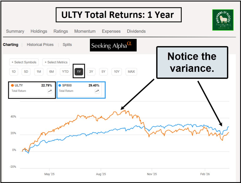 I went on to say, “You should notice three things about these specialized ETFs. 1) All three have high expense ratios. That is due to the fact that the fund manager wants to be paid for trading options for you. 2) All three have crazy high dividend yields (there is risk!), and 3) they are not diversified. Only ULTY is diversified, but its holdings are high-risk investments.”