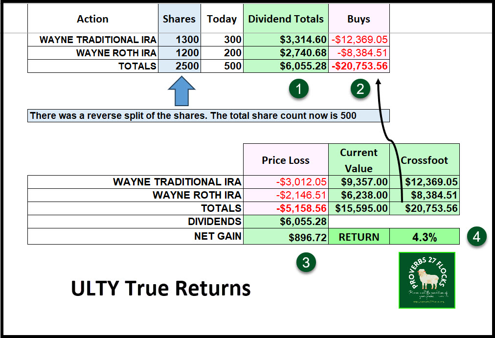 There are two other things worth mentioning. One, ULTY did a reverse split, so the number of shares I started with was reduced to a total of 500 at this time. Reverse splits can be unnerving and are frequently not a good sign.