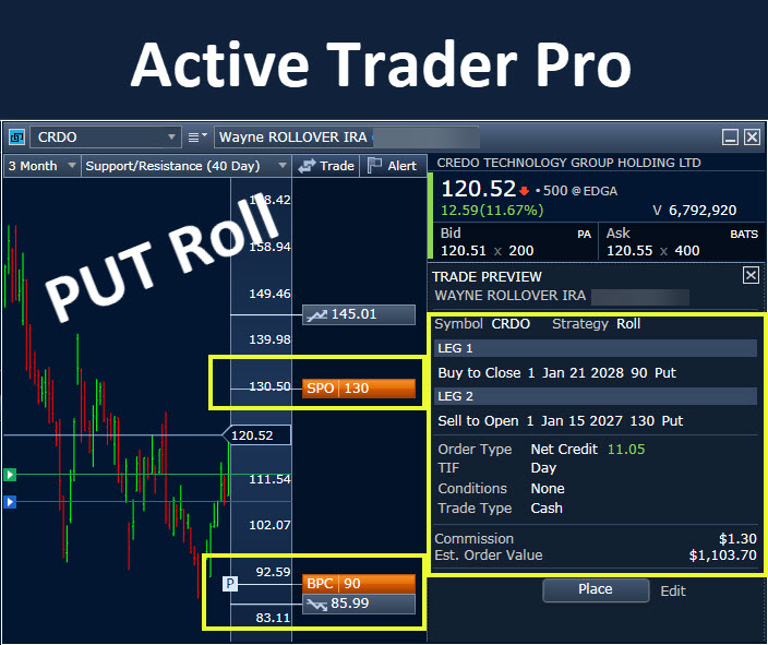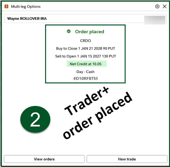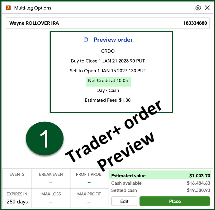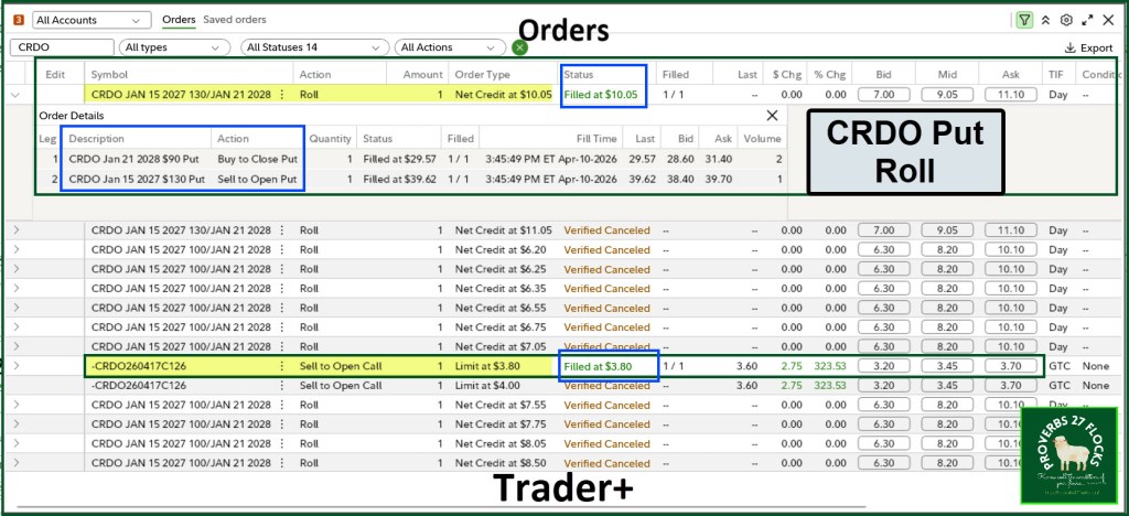 The other trade I entered on the same day was a PUT ROLL (-CRDO280121P90 was the old PUT contract and -CRDO270115P130). This resulted in income of $1,003.57.