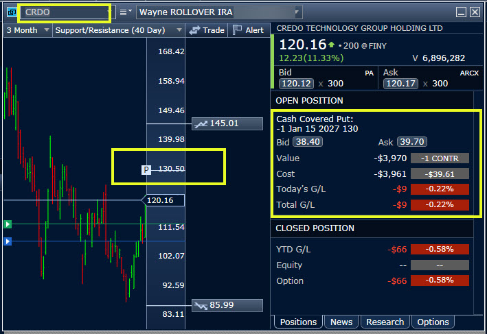 I started with selling a CRDO put option on January 27 with a strike price of $130. That means I needed to have $13,000 in my traditional IRA to cover this purchase. Many investors have $13K in cash available for options trading. If they don’t it is certainly not a hopeless task to save up $13K.