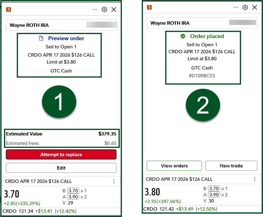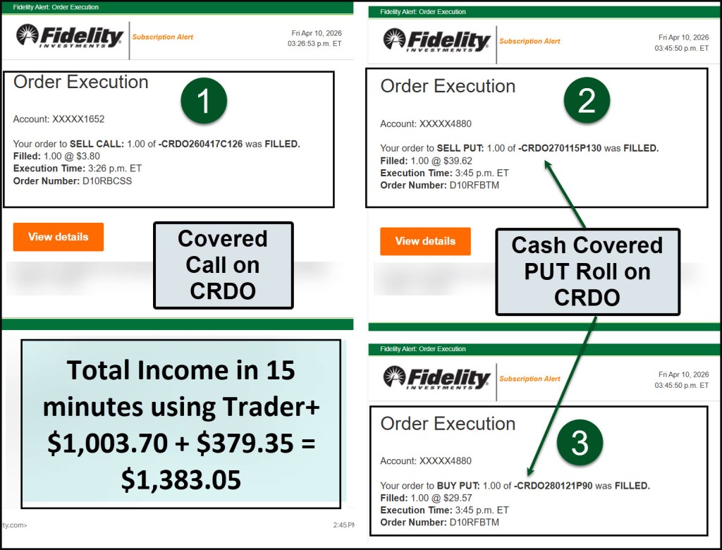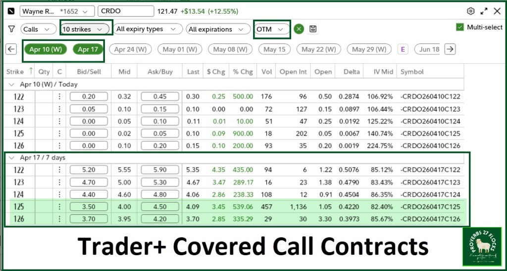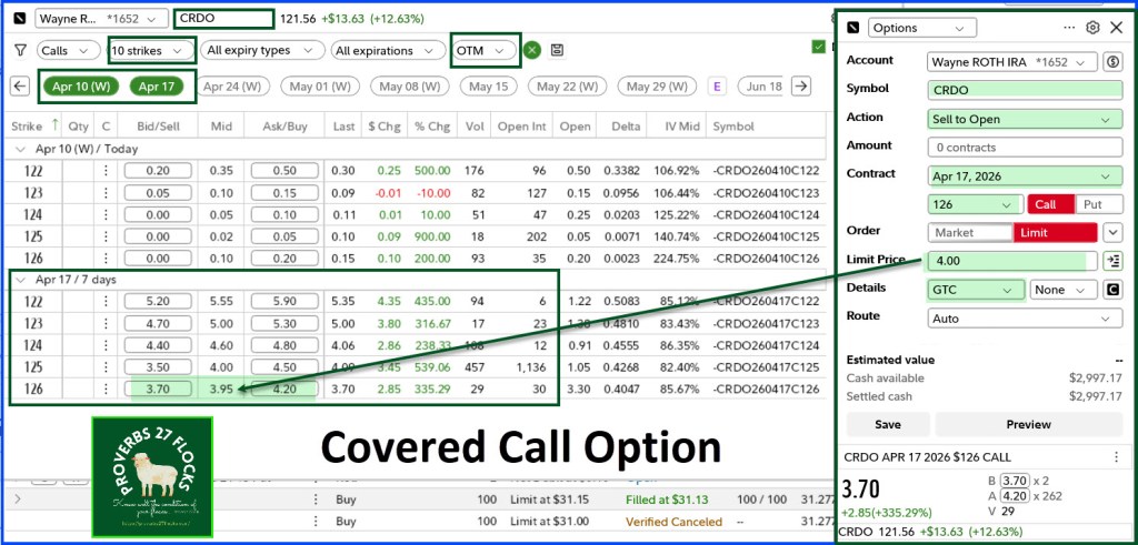 Instead, I entered a covered call trade for a strike price of $126. This contract expires on April 17, so I don’t have to wait long to see if my shares will be called. (This is the ticker symbol for the covered call option: -CRDO260417C126). My willingness to sell my shares resulted in net income of $379.33. I wanted $3.80 per share, and that is what I received. So, the $380, less the Fidelity commission of 67 cents gave me income. I like to think of this as a synthetic dividend. This got me started towards the $1,000.