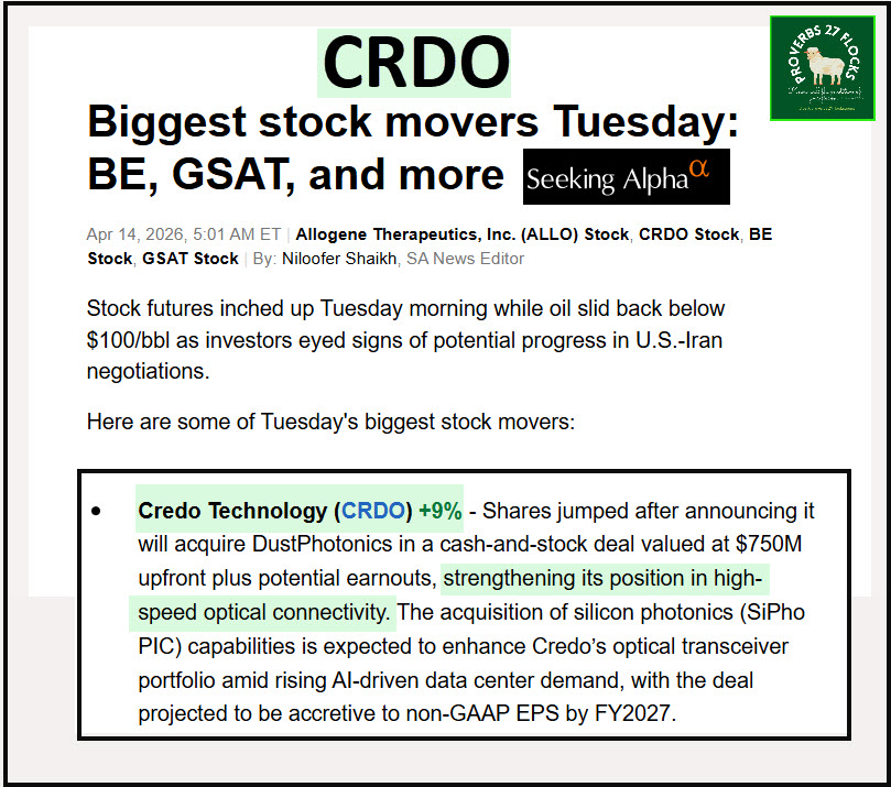 “Credo Technology (CRDO) +9% – Shares jumped after announcing it will acquire DustPhotonics in a cash-and-stock deal valued at $750M upfront plus potential earnouts, strengthening its position in high-speed optical connectivity. The acquisition of silicon photonics (SiPho PIC) capabilities is expected to enhance Credo’s optical transceiver portfolio amid rising AI-driven data center demand, with the deal projected to be accretive to non-GAAP EPS by FY2027.” – Seeking Alpha