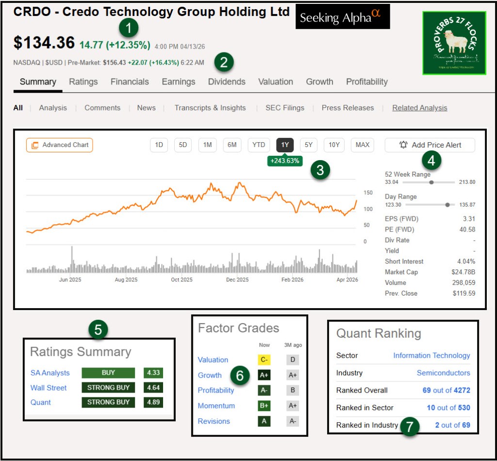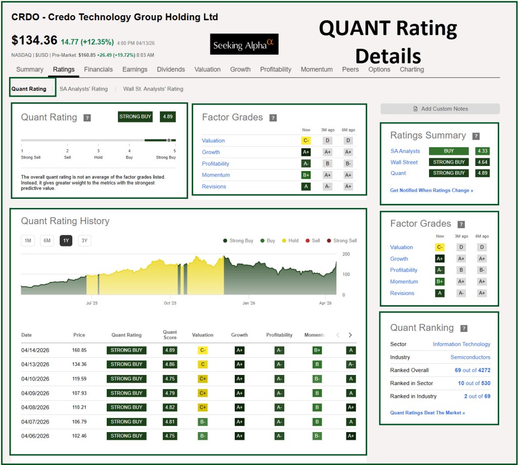 One way to understand the current situation is to look at the Seeking Alpha SUMMARY. Here are seven things to note: 1) Yesterday the shares closed at $134.36. That made me happy, because I have that open cash covered put at $130. 2) The premarket price for CRDO is now looking like it will be above $150 per share. 3) The one-year ROI is stunning. Those who bought shares at $33 are very happy if they held onto their shares. 4) CRDO’s stock is still under the 52-week high of $213.80. There might be more room for it to run higher. 5) Both Wall Street analysts and the Seeking Alpha QUANT ratings are “Strong Buy.” That doesn’t happen very often. 6) Always pay attention to profitability and growth. You want those to be green. 7) Pay attention to how CRDO fits in the herd of competitors, at least according to the QUANT rating.