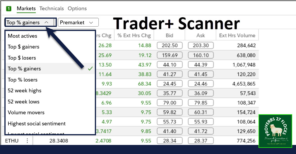 Another helpful tool in Trader+ is the market scanner. You can pick from dollar or percentage gainers or losers, most active, 52-week highs, 52-week lows, trading volume movers, or other options as shown here.