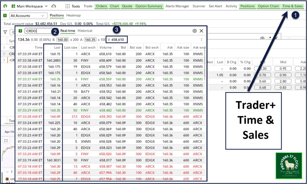 Trading volumes and trends matter when trading stocks or options. Trader+ has a helpful tool that is similar to the one in Fidelity’s Active Trader Pro. Clearly CRDO already has a high trading volume at 7:33AM EST (one hour before the official market opening.) That means there is a lot of interest in CRDO shares by short-term and long-term investors.