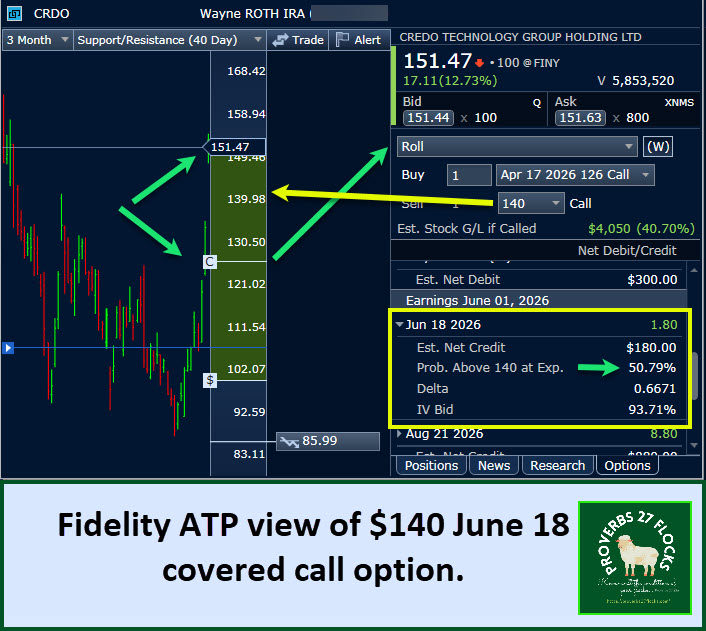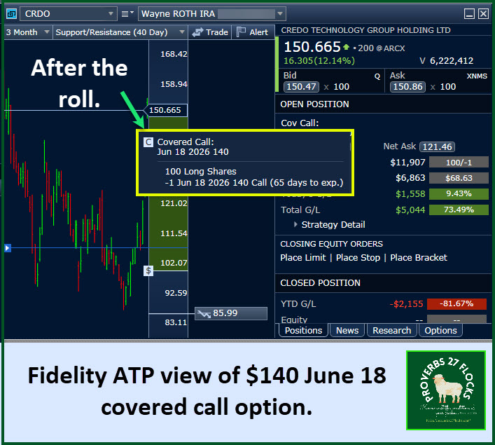 Now, if on June 18 the CRDO shares are still above $140/share, I will receive $14,000 instead of $12,600 for my block of 100 shares. In addition, I gained some income from the option roll of $000.00.