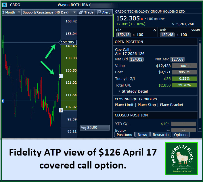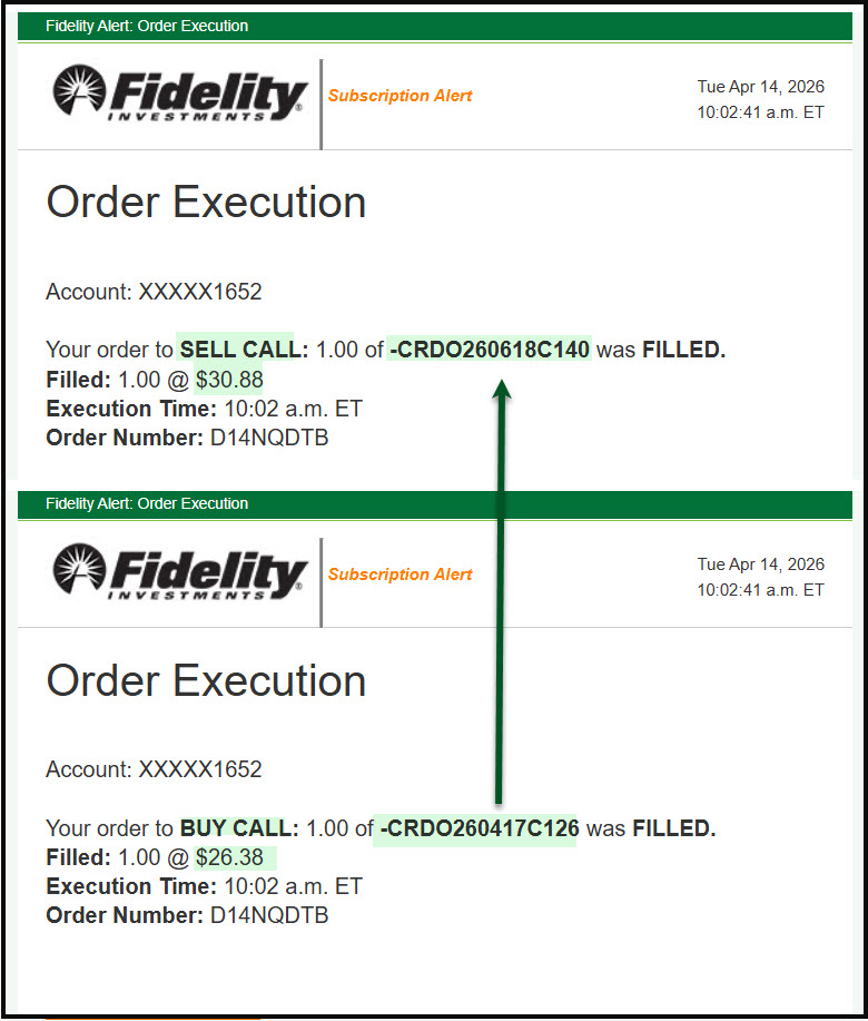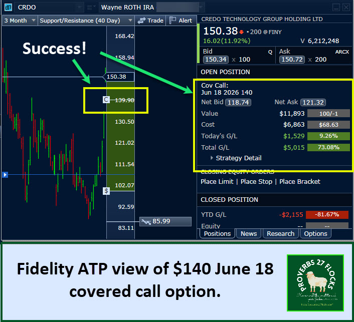 In yesterday’s post, “One Stock Every Morning”, I noted CRDO’s surprising rise in the price of my shares. This is one thing I said: “I hold 100 shares of CRDO in my ROTH IRA that I purchased in March for $99.50 per share. Today it looks like they will shoot up over $155 per share. That is bad news, as I have a covered call contract on those shares to sell them at $126 per share. To make matters worse, the contract expires on Friday.”