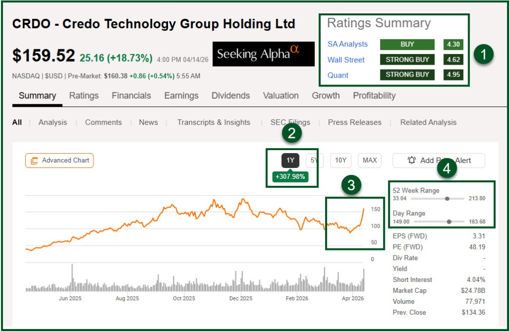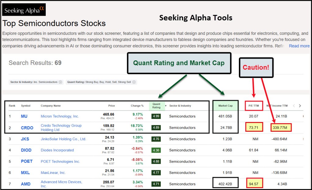 At least two of my readers have asked me if I use an Alpha Picks subscription to find investments like CRDO. The short answer is “no.” I use the Quant Rating feature known as “Ranked in Industry” to find the top-rated investments by industry. Using that tool, MU and CRDO are the cream on the top of the sixty-nine semiconductor companies. CRDO is number two.