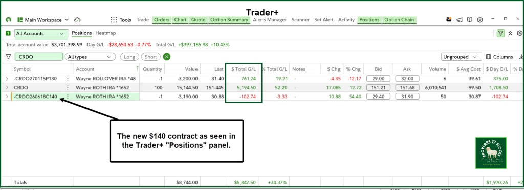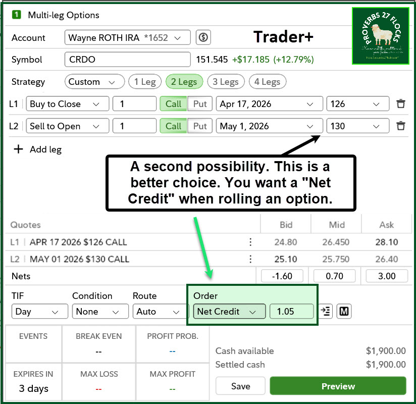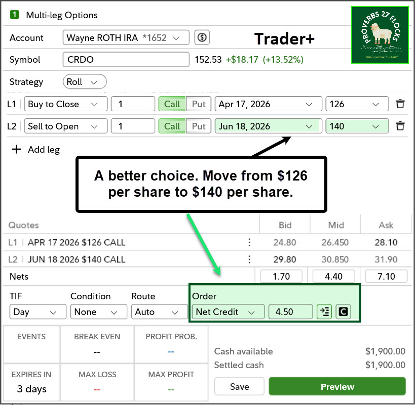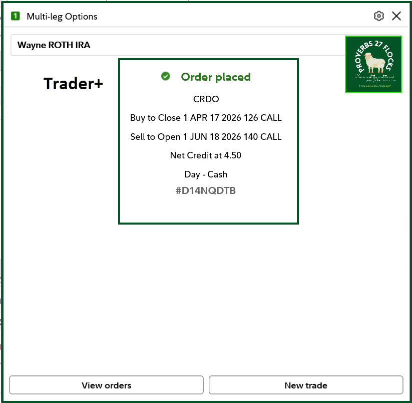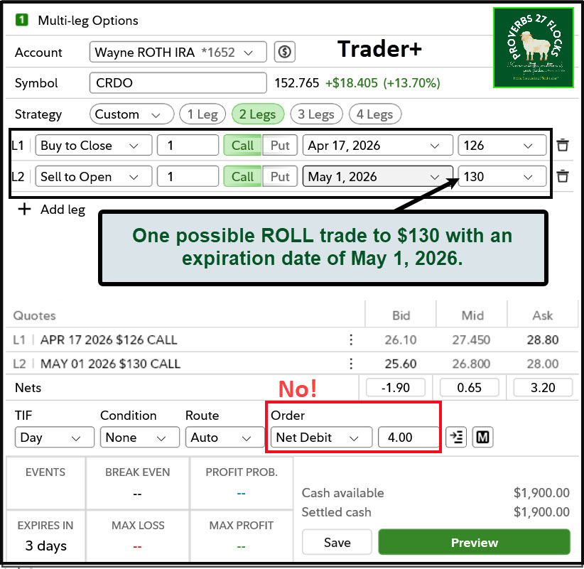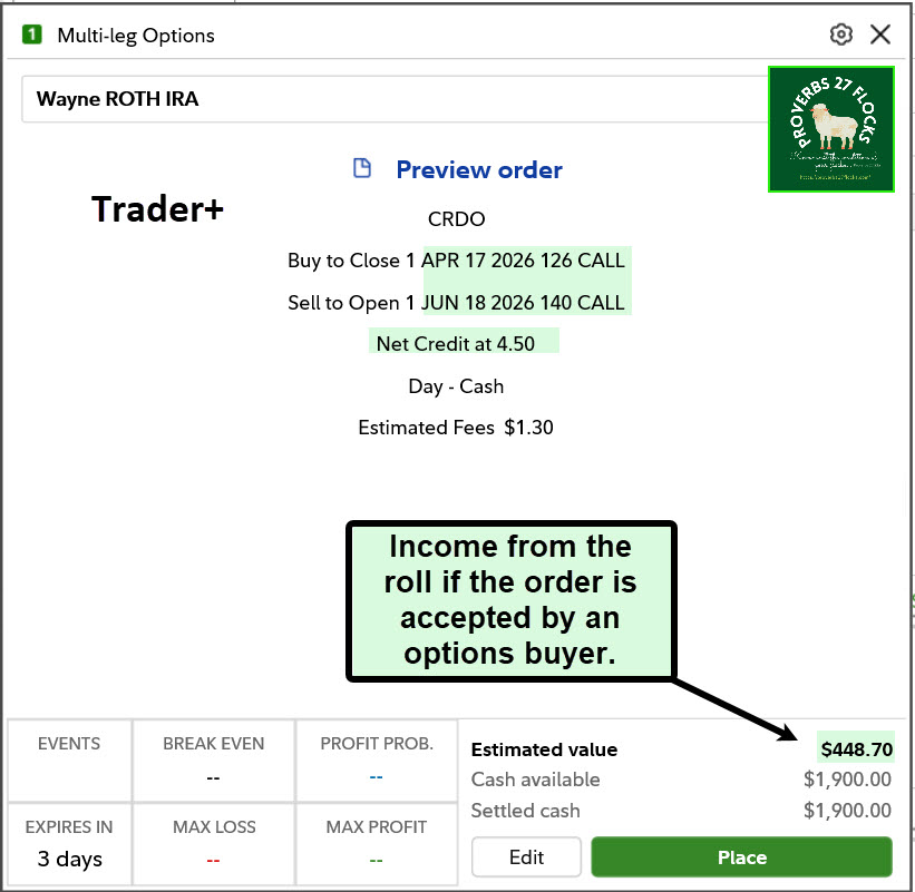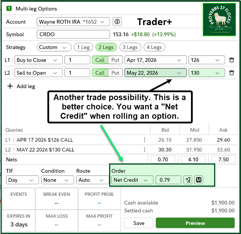 The second choice that is often feasible and rational is to roll the option. Rolling an option is accomplished with a single trade on Trader+. The essence of this trade is that it enters two trades. The first of the pair is a “BUY TO CLOSE” order to exit the existing contract. You have to pay someone to do this. The second part of the pair is a “SELL TO OPEN” order to roll the contract to a higher price with a longer expiration. For example, I rolled the CRDO contract from April 17 to June 18. The share price I can receive from my shares also moved up from $126 to $140. While this is less than the current share price of $159.52, the potential gain on the sale of the shares, along with the income from the BUY/SELL order is another piece of income.