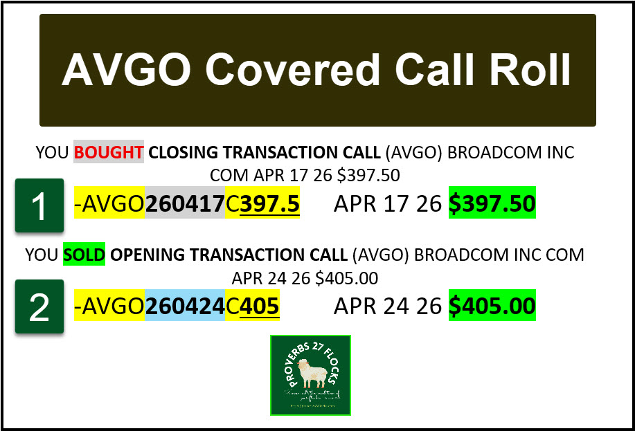 There are two pieces to a roll. You buy a transaction to close the existing covered call contract. In this case it cost me $603.67 to get out of that contract: YOU BOUGHT CLOSING TRANSACTION CALL (AVGO) BROADCOM INC COM APR 17 26 $397.5 -AVGO260417C397.5APR 17 26 $397.50.