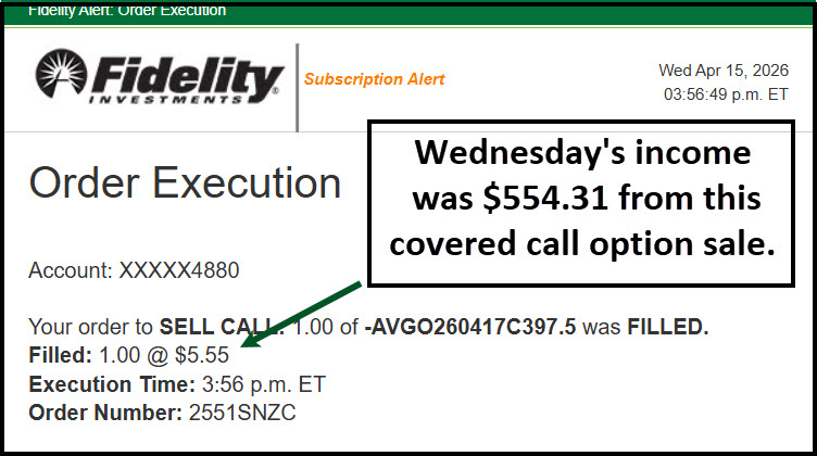 The other decision was related to an AVGO covered call option contract that was due to expire yesterday at 3PM CST. It was obvious that the price would be higher than my contract price of $397.50, so I looked for a way to increase the price I wanted for my shares and was successful in doing that very thing. Bear in mind that I already sold a covered call on AVGO on Wednesday and made about $554 in options income as a result.