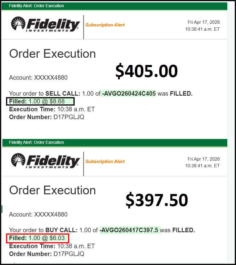The second piece is to sell a new contract and extend the expiration date by one week. I earned $867.31 from the buyer of the new contract. Therefore, I increased the potential for a better price for my 100 shares by $7.50. If you multiply $7.50 by 100 shares, the gain could be $750 plus the $263.64 I earned by rolling the contract. YOU SOLD OPENING TRANSACTION CALL (AVGO) BROADCOM INC COM APR 24 26 $405.00 -AVGO260424C405 APR 24 26 $405.00