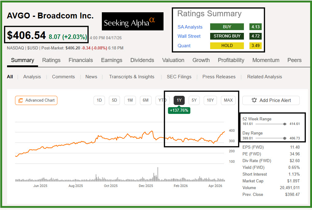 There is no easy way for the average investor to buy shares of AVGO at the current price if they want to trade options. Currently 100 shares would set you back $40,654. So unless your total investment balance is at least $800K, don’t risk more than 5% of your total account balances in AVGO.