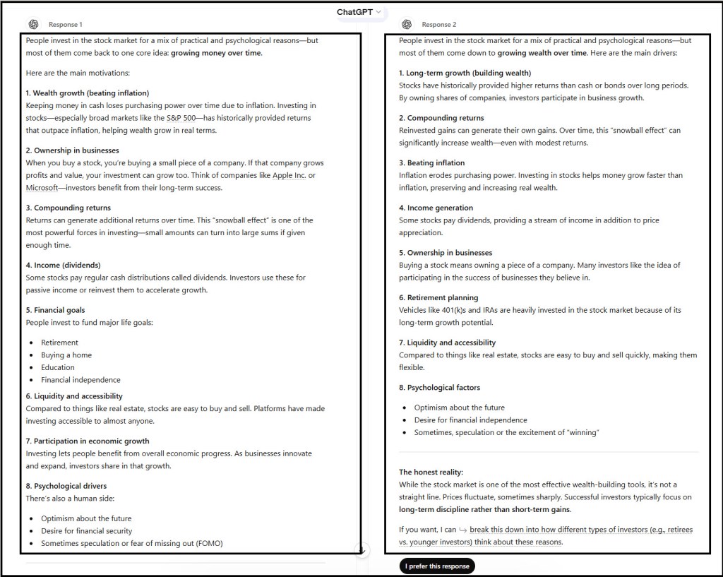I asked ChatGPT this question: “Why do people invest in the stock market?” Of course I was expecting to see things like building wealth (putting up bigger barns for more stuff), income generation, and retirement planning. Some invest like gamblers and others like to be connected to the companies they buy.