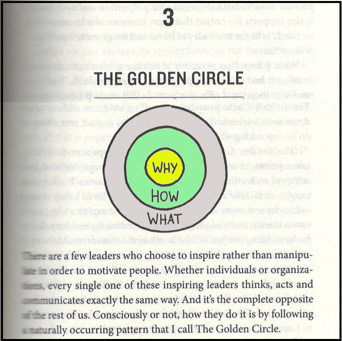 Many communicate from the “outside in” (what → how → why), but inspiring leaders communicate from the “inside out” (why → how → what). Sinek talks about “The Golden Circle” and introduces a model with three layers: 1) Why (purpose, cause, belief); 2) How (process or values); and 3) What (products or services). He suggests that people buy why, not what. In fact, much of good marketing is done focused on the “WHY” you should take a current action, buy a product, or accept some service. Here is an image from his book: