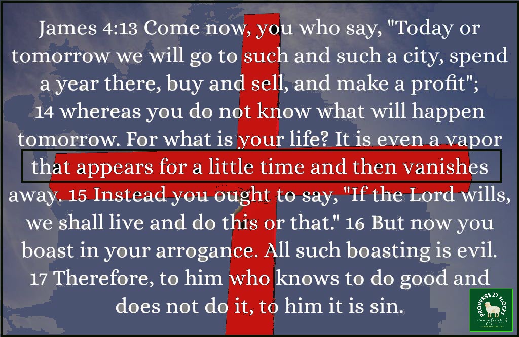 Here is a helpful reminder for Investors from James: James 4:13-17 “Come now, you who say, “Today or tomorrow we will go into such and such a town and spend a year there and trade and make a profit”— yet you do not know what tomorrow will bring. What is your life? For you are a mist that appears for a little time and then vanishes. Instead you ought to say, “If the Lord wills, we will live and do this or that.” As it is, you boast in your arrogance. All such boasting is evil. So whoever knows the right thing to do and fails to do it, for him it is sin.”